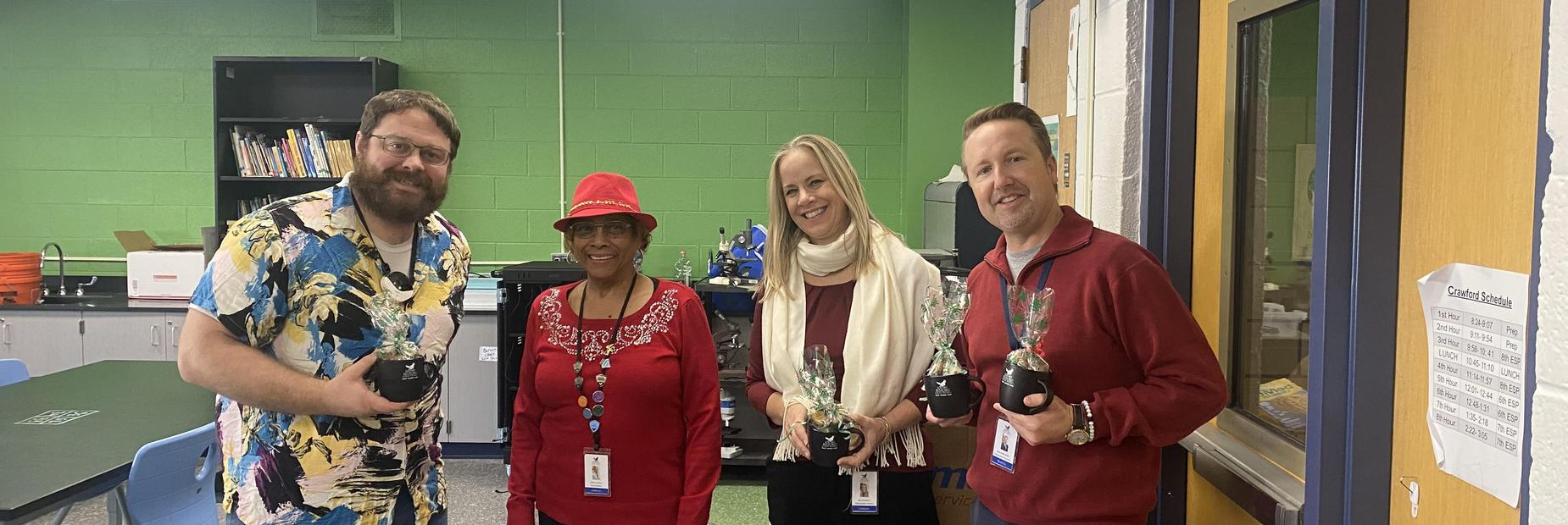 Superintendent Bobrovetski, Curriculum Director Davidson, and Board Member Tolliver spreading holiday cheer to the staff of Pierce.